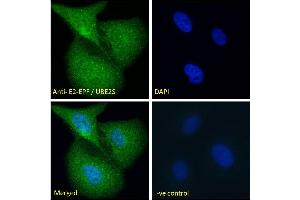 Immunofluorescence: Strong expression of the protein seen in the cytoplasm and nuclei of A431 and HeLa cells. Recommended concentration: 10μg/ml.