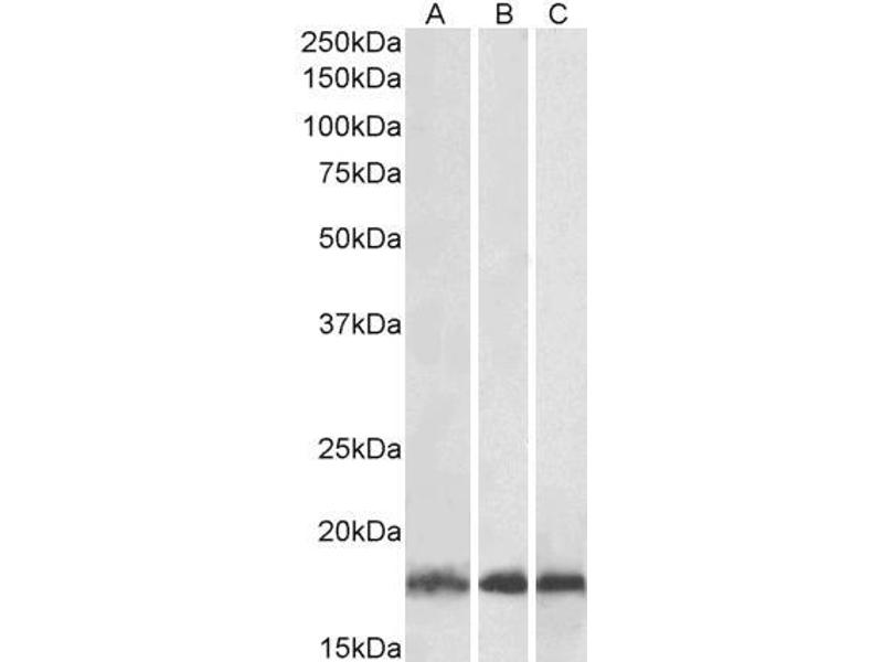 Western Blot: Approx 18 kDa band observed in lysates of cell lines HeLa HEK293, HepG2 and Jurkat and also in lysates of Human, Mouse and Rat Heart, Skeletal Muscle and Testis and of Pig Heart (calculated MW of 17.9 kDa according to Human NP_003338.1 and Mo