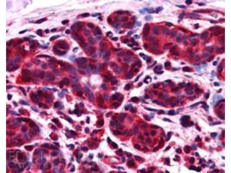 Immunohistochemistry: In paraffin embedded Human Breast shows strong cytoplasm staining in epithelial and myoepithelial duct cells. Recommended concentration, 2-4 μg/mL.