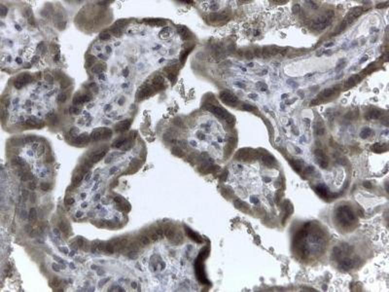 Immunohistochemistry: In paraffin embedded Human Placenta shows strong staining of the cytotrophoblasts. Recommended concentration, 2-4 μg/mL.