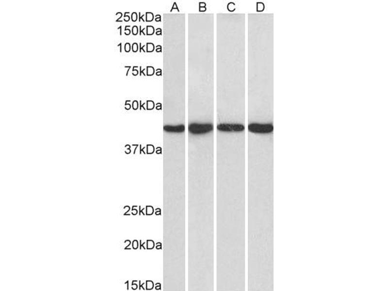 Western Blot: Approx 40 kDa band observed in nuclear lysates of cell lines HeLa, HepG2, Jurkat and NIH3T3 (calculated MW of 38.5 kDa according to Human NP_054829.2 and to Mouse NP_666266.1). Recommended concentration: 0.3-1 μg/mL. Primary incubation was 1 h