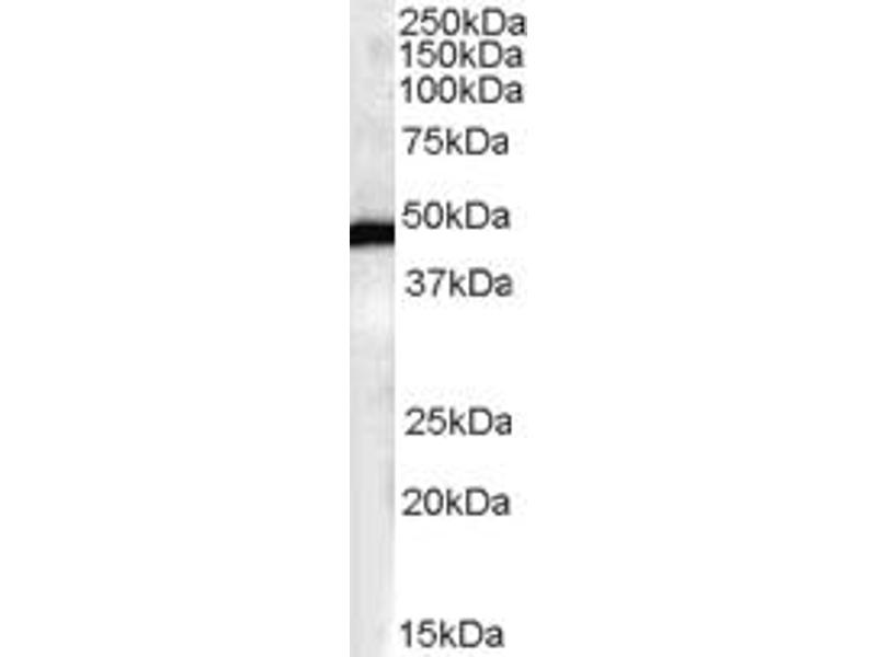 Western Blot: Preliminary testing showed a band at approx 48 kDa in Human Kidney lysate after 0.1 μg/mL antibody staining (calculated MW of 47.1 kDa according to NP_036289.2). Primary incubation 1 hour at room temperature.