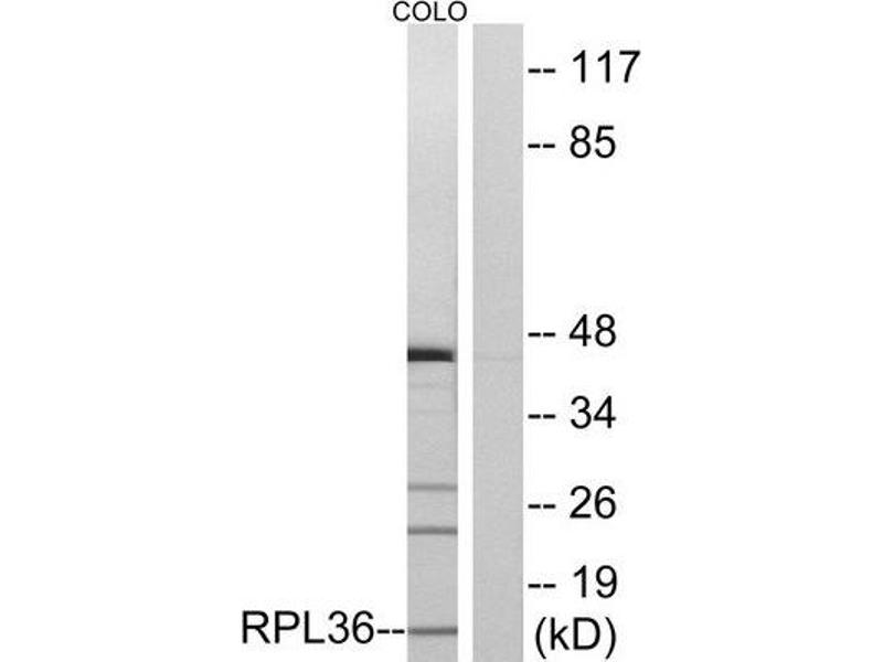 The antiserum was produced against synthesized peptide derived from internal of human RPL36.