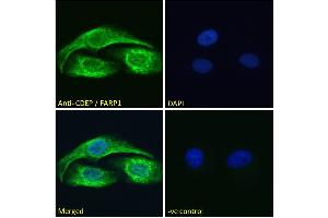 Immunofluorescence: Strong expression of the protein seen in the cytoplasm of U2OS and HeLa cells. Recommended concentration: 10μg/ml.