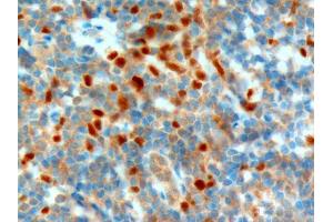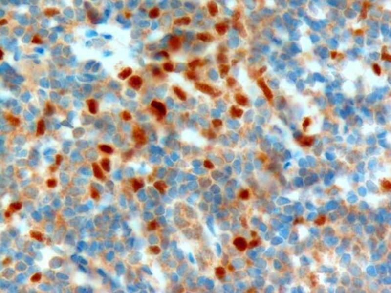 Immunohistochemistry: In paraffin embedded Human Tonsil shows nuclear staining of many cells in the interfollicular area of the tonsil. Macrophages in germinal centres of secondary follicles are also positive. Recommended concentration, 1-2 μg/mL.