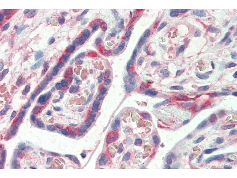 Immunohistochemistry: Paraffin embedded Human Placenta. Recommended concentration: 5 μg/mL.