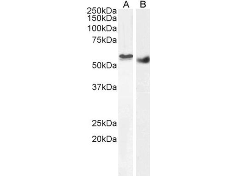 Western Blot: Approx 55 kDa band observed in Human Breast cancer and in Mouse and Pig Testis lysates, and approx. 58 kDa in nuclear lysates of cell line HEK293 (calculated MW of 58.1 kDa according to Human NP_543026.2, 59.5 kDa according to Mouse NP_899085.3