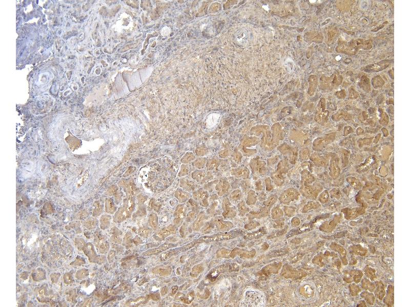 Immunohistochemistry: Paraffin embedded Human Kidney. Recommended concentration: 5 μg/mL.