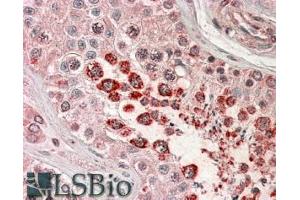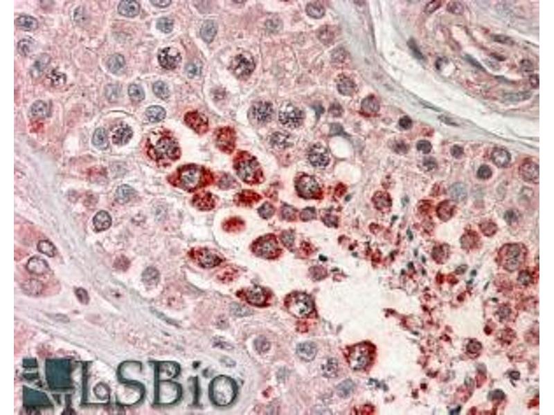 Immunohistochemistry: In paraffin embedded Human testis shows polar cytoplasm staining in primary spermatocytes. Recommended concentration, 3-6 μg/mL.