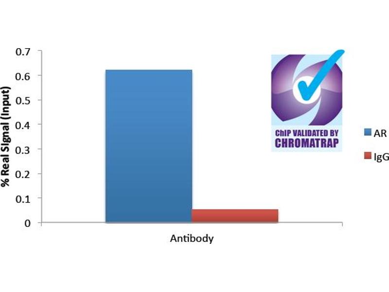 Chromatin Immunoprecipitation: A six-fold increased presence of the FKBP5 locus observed when comparing the precipitations using EB06441 with non-specific goat IgG to bring down Androgen Receptor in a chromatin lysate from DHT-stimulated HEC50 cells.