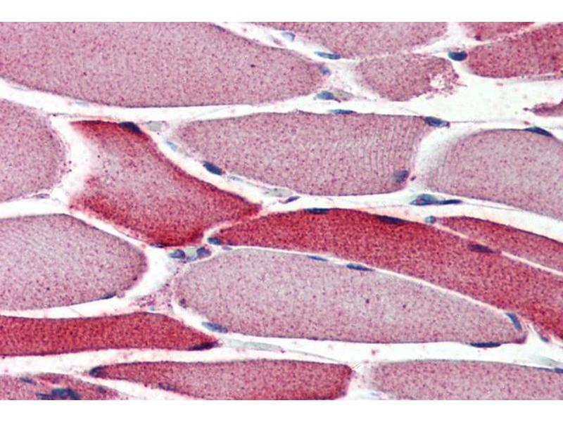 Immunohistochemistry: Paraffin embedded Human Skeletal Muscle and Heart. Recommended concentration: 4 μg/mL.