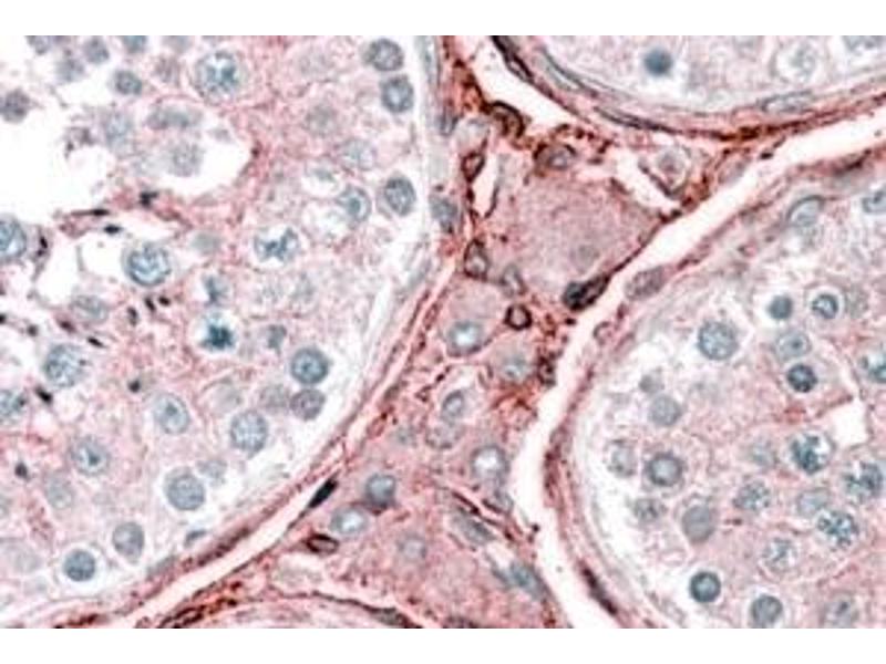 Immunohistochemistry: In paraffin embedded Human Testis shows membranous staining in primarily myofibroblasts of the basement membrane surrounding the seminiferous tubules. Recommended concentration: 2-5 μg/mL. Paraffin embedded Human Small Intestine. Rec