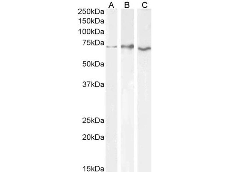Western Blot: Approx 70 kDa band observed in HepG2 and Jurkat cell lysates (calculated MW of 67.8 kDa according to NP_000656.1). Recommended concentration: 0.3-1 μg/mL. Primary incubation 1 hour at room temperature.