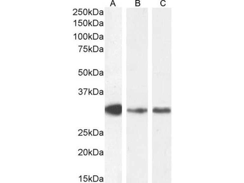 Western Blot: Approx 28 kDa band observed in Human Spleen lysates (calculated MW of 28.3 kDa according to NP_001166039.2). Recommended concentration: 0.3-0.5 μg/mL. Primary incubation1 hour at room temperature.