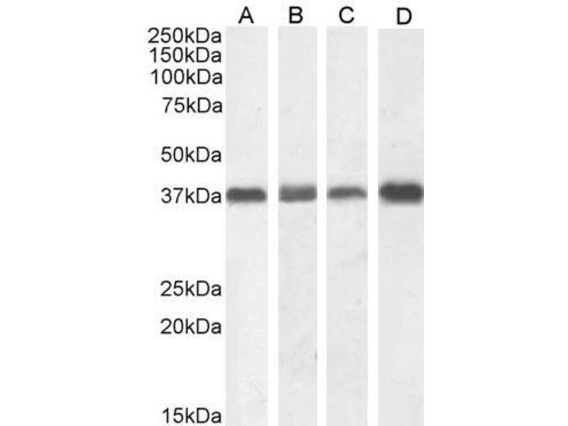 Western Blot: Approx 37 kDa band observed in lysates of cell lines Daudi, Jurkat, K562 and NIH3T3 and in Mouse Spleen lysates (calculated MW of 32.6 kDa according to Human NP_001341935.1 and Mouse NP_032748.1). This molecular weight is routinely observed b
