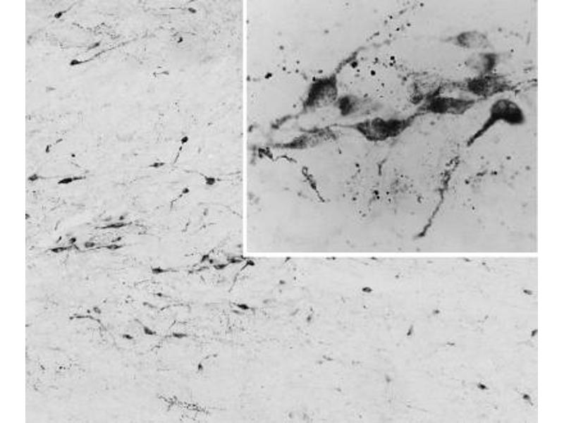 Immunohistochemistry: Frozen section of Human Hypothalamus shows staining of a group of neuronal cell bodies in the human infundibular (arcuate) nucleus and their varicose axons. Recommended concentration: 0.05-0.1 μg/mL.