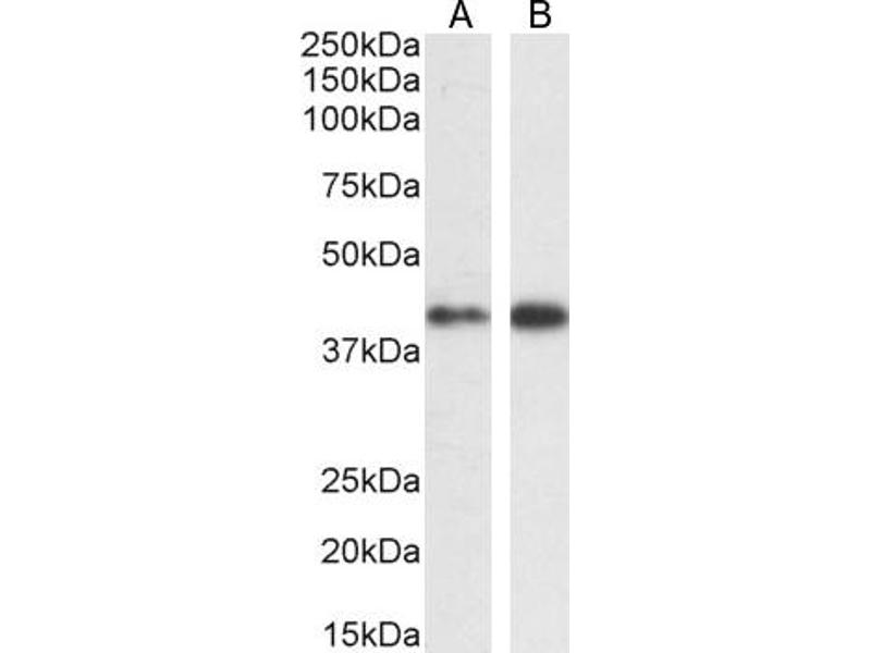 Western Blot: Approx 40 kDa band observed in Human Cerebellum lysates and in lysates of cell lines A431 and HepG2, and approx 42 kDa obseved in Human Frontal Cortex lysates (calculated MW of 40.1 kDa according to NP_001035145.1 and 43.1 kDa according to NP_0