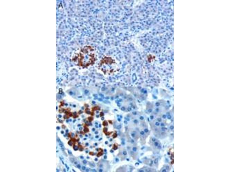 Immunohistochemistry: In paraffin embedded Human Pancreas shows strong staning in Islets of Langerhans. Recommended concentration, 2-4 μg/mL.