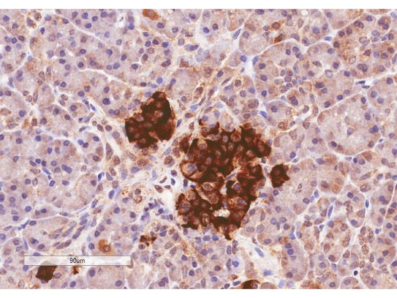 Immunohistochemistry: In paraffin embedded Human Pancreas shows strong staning in Islets of Langerhans. Recommended concentration, 2-4 μg/mL.