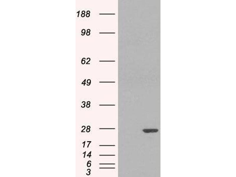Western Blot: Approx 25 kDa band observed in Human Kidney, Lung and Thymus lysates, lysates of cell lines HeLa, HEK293, Jurkat, CaCo-2, K562, NIH3T3, KNRK and MDCK, and, in nuclear lysates of cell lines HeLa, HEK293 and Jurkat (calculated MW of 23.4 kDa ac