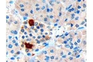 Immunohistochemistry: In paraffin embedded Human Pancreas, shows strong cytoplasmic staining of rare cells located at the periphery of islets of Langerhans. Recommended concentration: 3 μg/mL. Paraffin embedded Human Pancreas and Intestine. Recommended co