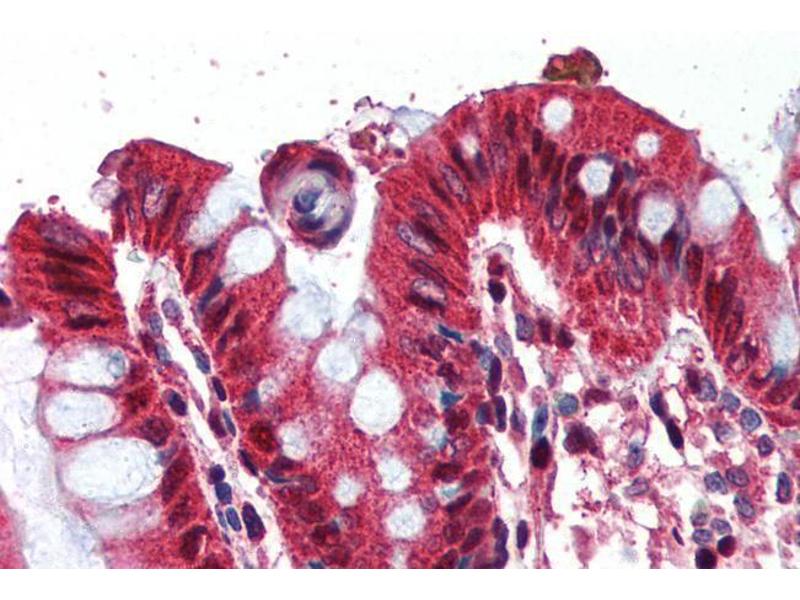 Immunohistochemistry: In paraffin embedded Human Placenta shows staining of trophoblast cytoplasm. Recommended concentration: 2-5 μg/mL. Paraffin embedded Human Colon. Recommended concentration: 2 μg/mL.