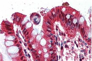 Immunohistochemistry: In paraffin embedded Human Placenta shows staining of trophoblast cytoplasm. Recommended concentration: 2-5 μg/mL. Paraffin embedded Human Colon. Recommended concentration: 2 μg/mL.