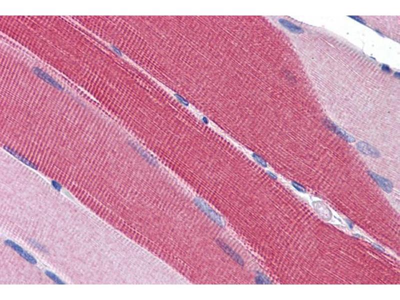 Immunohistochemistry: Paraffin embedded Human Skeletal Muscle and Heart. Recommended concentration: 5 μg/mL.