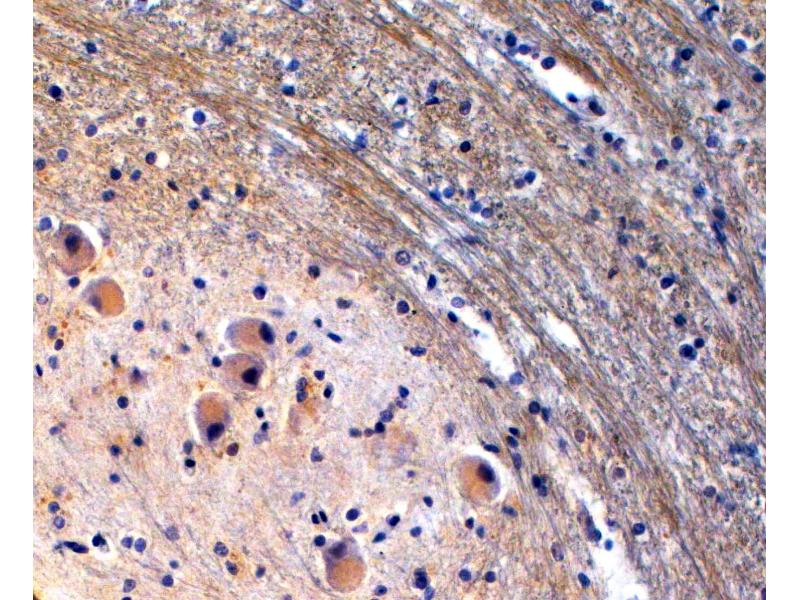 Immunohistochemistry: In paraffin embedded Human Brain Stem shows staining of the cytoplasm of Purkinje cells and of neuron projections. Recommended concentration, 2-4 μg/mL.