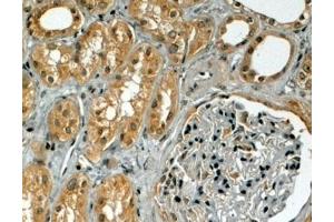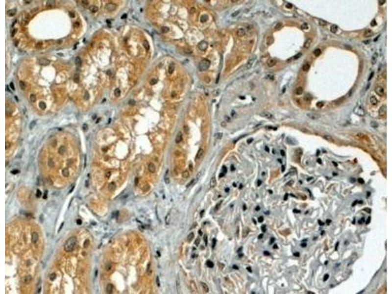 Immunohistochemistry: In paraffin embedded Human Kidney shows cytoplasm staining in PCT. Recommended concentration, 3-6 μg/mL.