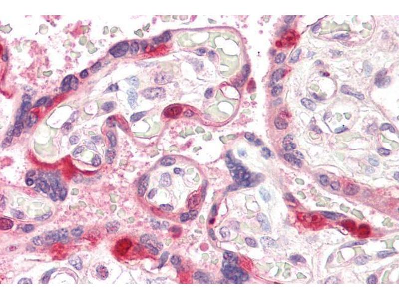Immunohistochemistry: Paraffin embedded Human Placenta. Recommended concentration: 3.75 μg/mL.