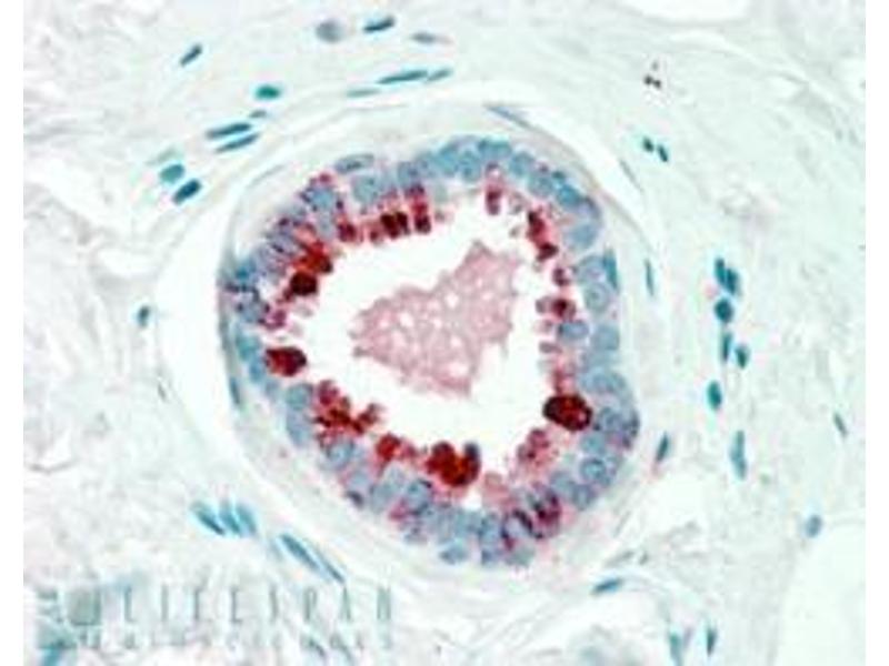 Immunohistochemistry: In paraffin embedded Human Breast shows staining of luminal epithelial cells of the lactiferous duct. Recommended concentration: 2-3 μg/mL.