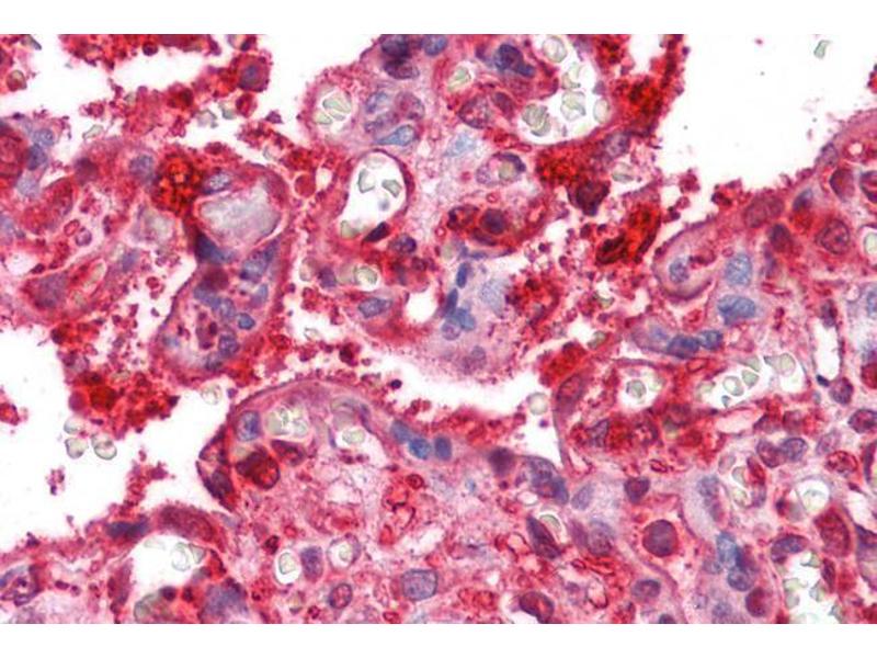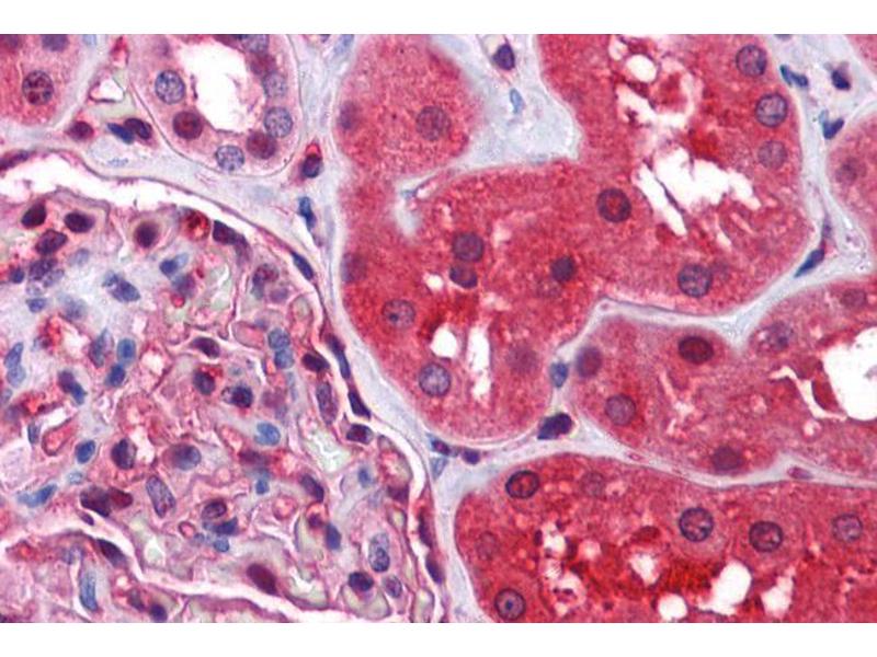 Immunohistochemistry: Paraffin embedded Human Placenta and Kidney. Recommended concentration: 2.5 μg/mL.