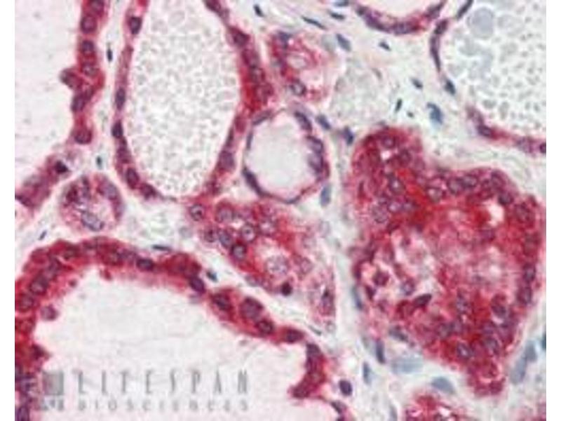 Immunohistochemistry: In paraffin embedded Human Thyroid Gland shows staining of cytoplasm and cell membrane of epithelial cells surrounding the follicles. Recommended concentration, 2-3 μg/mL.