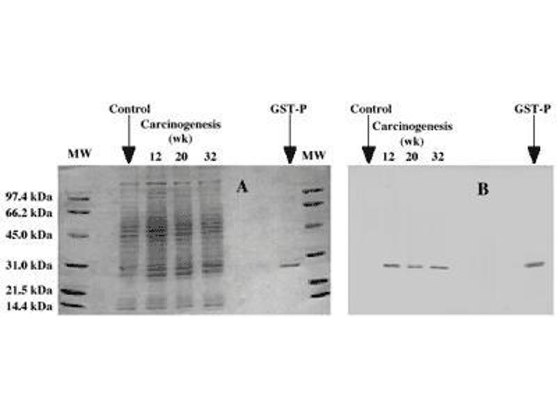Recognizes human, rat and leishmania GST-Pi. Does not cross-react with human or rat alpha GST. Species Reactivity: Human, rat and leishmania. Others not tested. Positive Control: Use rat hepatocarcinoma. The optimal dilution for a specific application should be determined by the researcher.