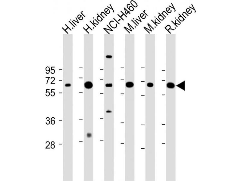 This PCK1 antibody is generated from rabbits immunized with a KLH conjugated synthetic peptide between 592-622 amino acids from the C-terminal region of human PCK1.