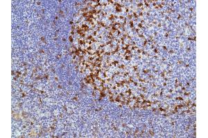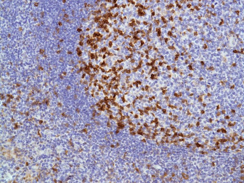 Usage: IMMUNOHISTOCHEMISTRY: Formalin-fixed, paraffin-embedded tissues are suitable for use with this primary antibody. Deparaffinization: Deparaffinize slides using xylene or xylene alternative and graded alcohols. Antibody Dilution: If using the concentrate format of this product, dilute the antibody 1:100. Antigen Retrieval: Boil tissue section in 1 mM EDTA buffer, pH 8.0 for 10 min followed by cooling at room temperature for 20 min. Primary Antibody Incubation: Incubate for 30 minutes at room temperature. Slide Washing: Slides must be washed in between steps. Rinse slides with PBS/0.05 % Tween. Positive control: Tonsil, reactive lymph node . Cellular localization: Membrane. -