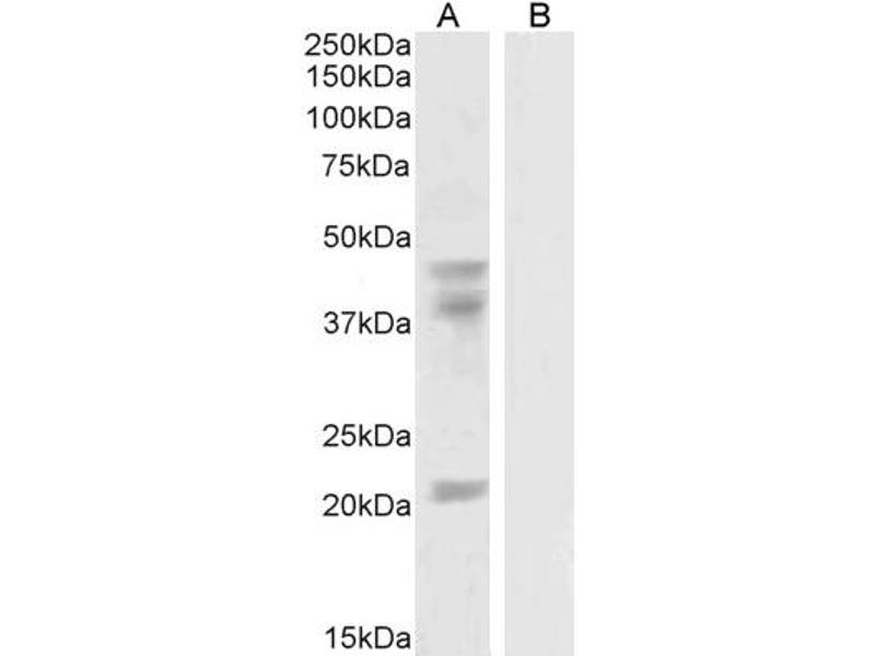 Western Blot: Approx 45+38 kDa bands observed in lysates of cell line HeLa (calculated MW of 42.5 kDa according to NP_005245.2, NP_001307844.1 and of 38.1 kDa according to NP_002032.2). An additional band of unknown identity was also consistently observed