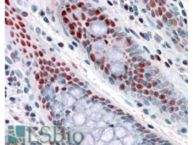 Immunohistochemistry: In paraffin embedded Human Colon shows nuclear staining in absorptive cells. Recommended concentration, 3-6 μg/mL.