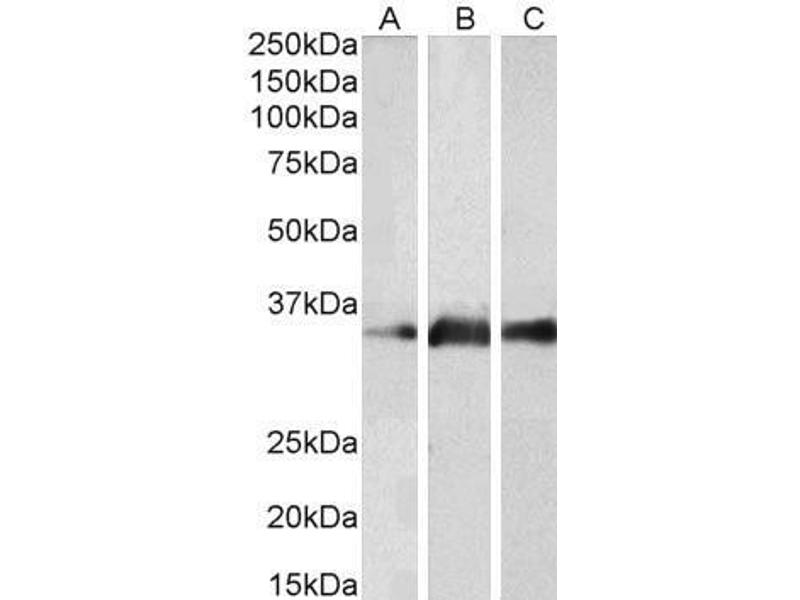 Western Blot: Approx 35 kDa band observed in Human Brain (Cerebellum), Mouse Brain and Rat Brain lysates (calculated MW of 32.0 kDa according to NP_036559.1). Recommended concentration: 1-3 μg/mL.