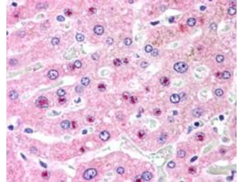 Immunohistochemistry: In paraffin embedded Human Liver shows staining of nucleoli in select hepatocytes. Recommended concentration, 2.5 μg/mL.