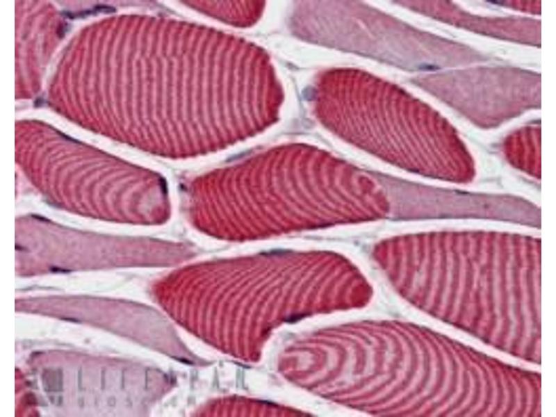 Immunohistochemistry: In paraffin embedded Human Skeletal Muscle shows striated pattern staining of majority of muscular fibres. Recommended concentration, 3-5 μg/mL.