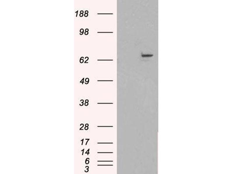 Western Blot: Approx 70 kDa band observed in lysates of cell line HeLa, and in nuclear lysates of cell line Jurkat (calculated MW of 68.6 kDa according to NP_004620.1). In transfected HEK293 transiently expressing FANCG a band of approx. 65 kDa is observed.