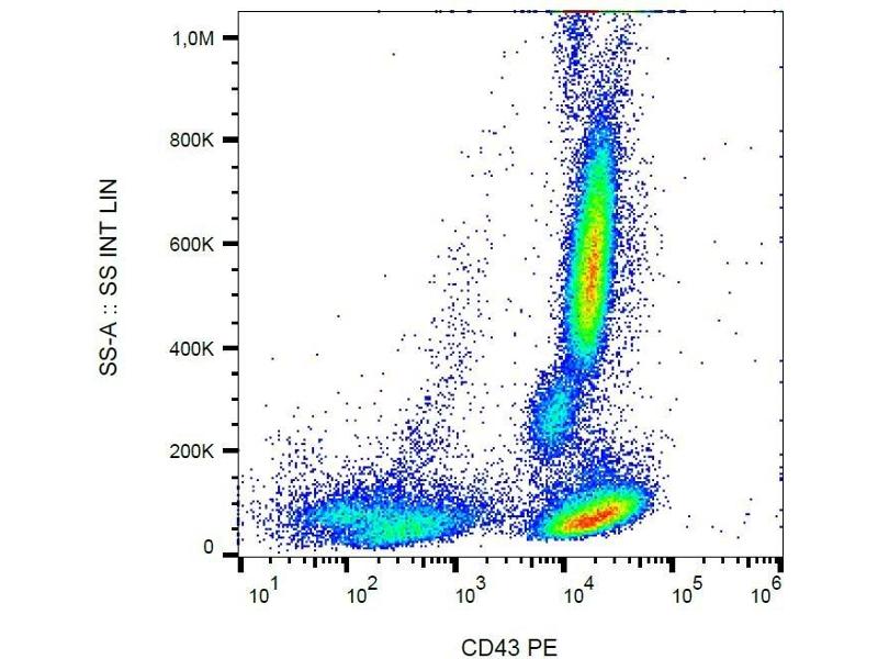 The antibody MEM-59 recognizes a neuraminidase-sensitive extracellular epitope on CD43 (Leukosialin), a 95-135 kDa type I transmembrane glycoprotein (mucin-type) which is involved in lymphocyte activation. CD43 is expressed by platelets and at high levels on the surface of all leukocytes, it is negative on resting B lymphocytes and erythrocytes.