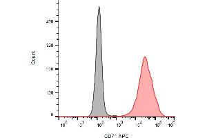 Transferrin receptor,CD71 (transferrin receptor) is a type II transmembrane glycoprotein expressed as homodimer in erythroid blood cell line and in activated leukocytes. Upon binding of holotransferrin (complex of transferrin and iron ions), CD71 is internalized by clathrin-mediated endocytosis. Acidification of endosomes by vesicular membrane proton pumps leads to dissociation of iron ions, whereas transferrin (apotransferrin) remains associated with CD71 and recycles to the cell surface, where it is released upon exposure to normal pH . CD71 is also involved in uptake of non-transferrin bound iron.,TfR1, TfR, TR, Trfr, T9, p90, TFRC