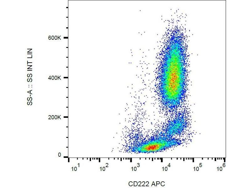 Insulin like growth factor 2 receptorprovided,CD222 (CIMPR, cation-independent mannose 6-phosphate receptor, IGF2 receptor) is a ubiquitously expressed 250 kDa transmembrane protein. No more than 10 % of CD222 is present on the cell surface where it serves as a multifunctional receptor. Intracellular (major) fraction of CD222 is involved in transport of newly synthesized lysosomal enzymes modified by mannose 6-phosphate from Golgi apparatus to lysosomes. The cell surface CD222 binds and internalizes exogeneous mannose 6-phosphate-containing ligands. Importantly, CD222 is crutial for internalization and degradation of insulin-like growth factor 2, thus controling cell growth. CD222 also complexes CD87 (urokinase-type plasminogen-activator receptor), plasminogen and latent TGF-beta, last but not least CD222 serves as a receptor for heparanase and even for Listeria.,IGF2R, MPR1, CIMPR, MPR300, M6P-R