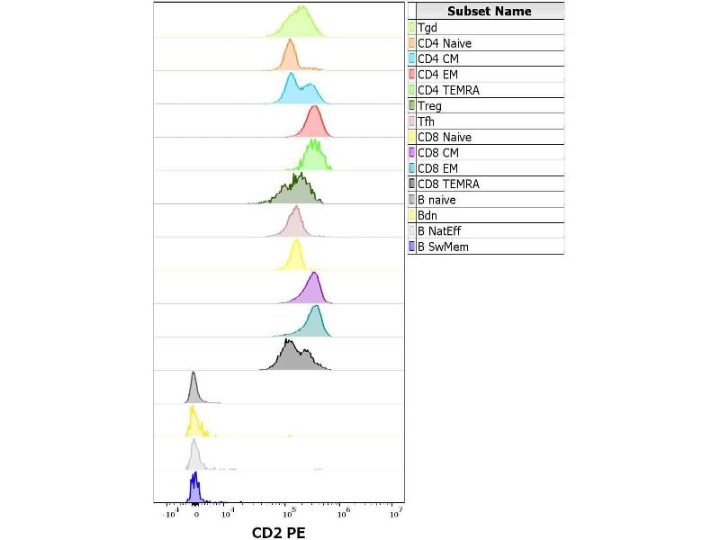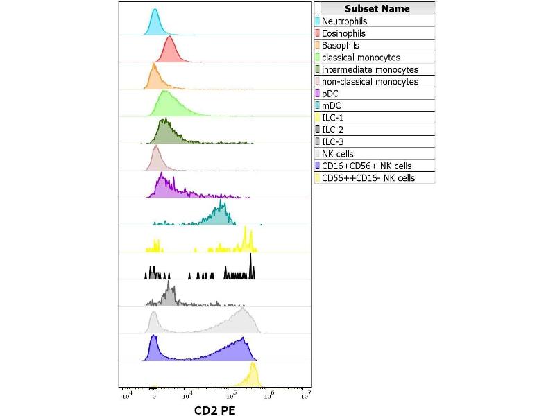 The antibody LT2 reacts with an extracellular epitope of CD2, a 50 kDa glycoprotein present on the human peripheral blood T lymphocytes and NK cells, also expressed by all thymocytes.