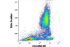 CD45R0 is the shortest isoform of a receptor-type protein tyrosine phosphatase, CD45 glycoprotein. CD45 is crucial in lymphocyte development and antigen signaling, serving as an important regulator of Src-family kinases, promotes cell survival by modulating integrin-mediated signal transduction pathway and is also involved in DNA fragmentation during apoptosis. CD45 isoforms differ in their extracellular domains, whereas they share identical transmembrane and cytoplasmic domains. These isoforms differ in their ability to translocate into the glycosphingolipid-enriched membrane domains and their expression depends on cell type and physiological state of the cell. CD45R0 is expressed e.g. on macrophages, CD8+ T cells, activated T cells and myeloma cells.,PTPRCR, T200R0