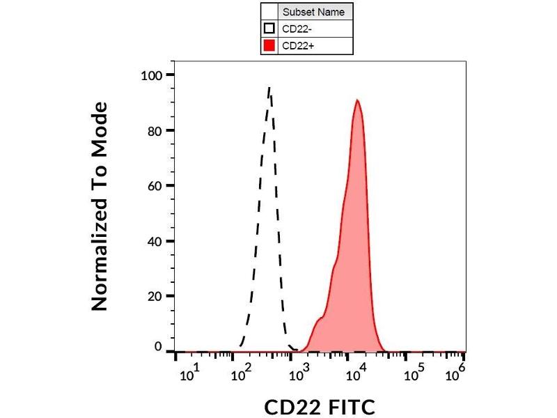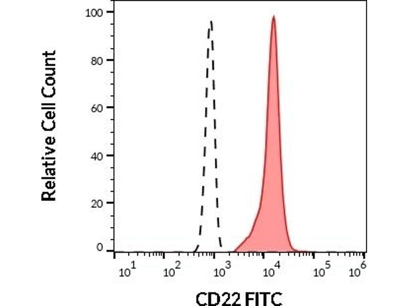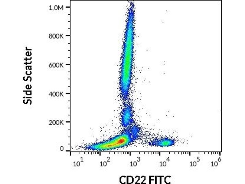 The antibody IS7 reacts with an extracellular epitope of CD22 (BL-CAM), a 130 kDa type I transmembrane glycoprotein (immunoglobulin superfamily) expressed in the cytoplasm of pro-B and pre-B lymphocytes, and on the surface of mature and activated B lymphocytes, it is lost on plasma cells, peripheral blood T lymphocytes, granulocytes and monocytes.