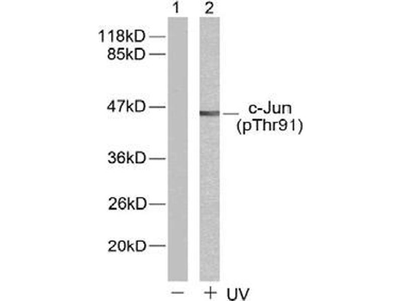 - The antibody was affinity-purified from rabbit antiserum by affinity-chromatography using epitope-specific phosphopeptide. The antibody against non-phosphopeptide was removed by chromatography using non-phosphopeptide corresponding to the phosphorylation site. c-Jun (phospho-Thr91) antibody detects endogenous levels of c-Jun only when phosphorylated at threonine 91.